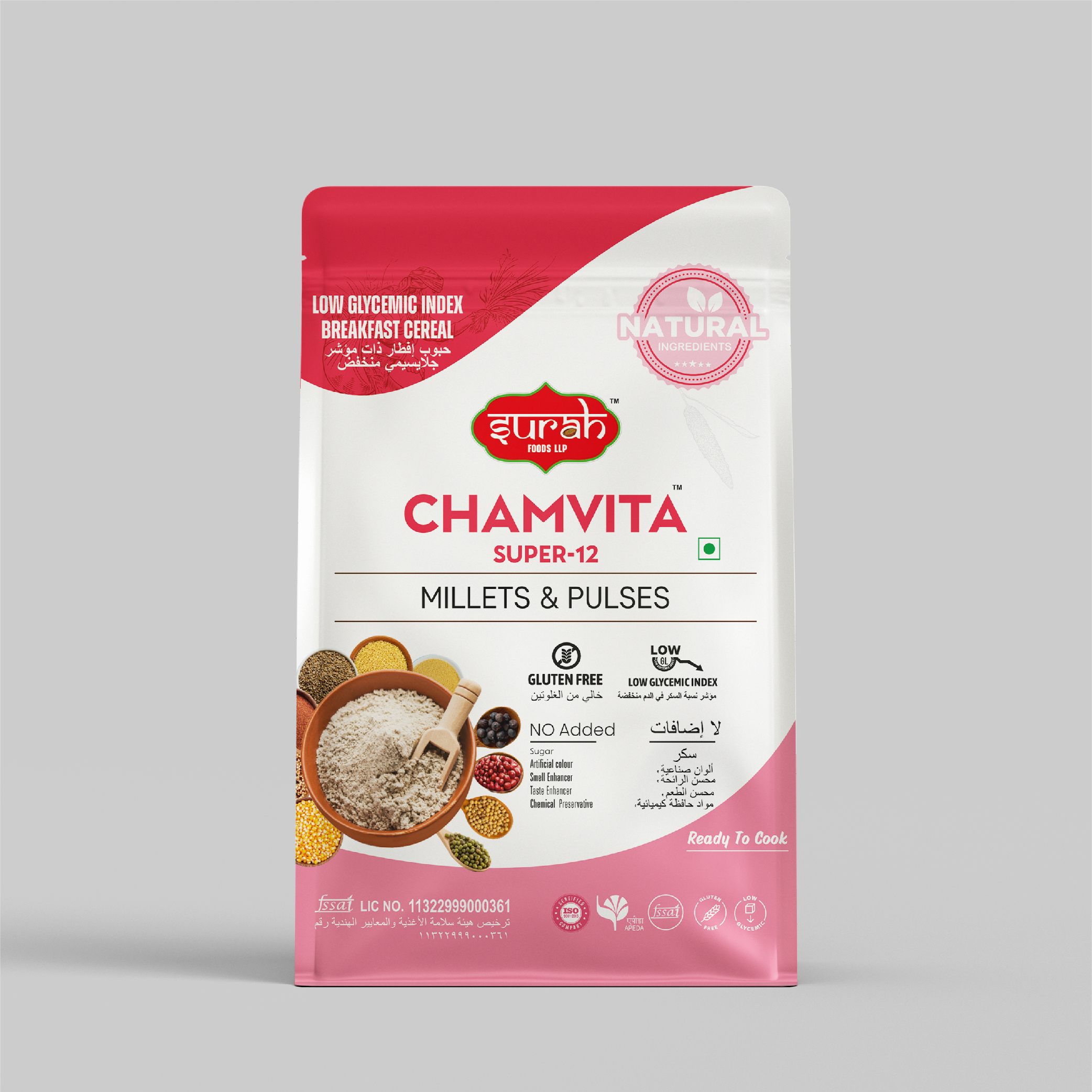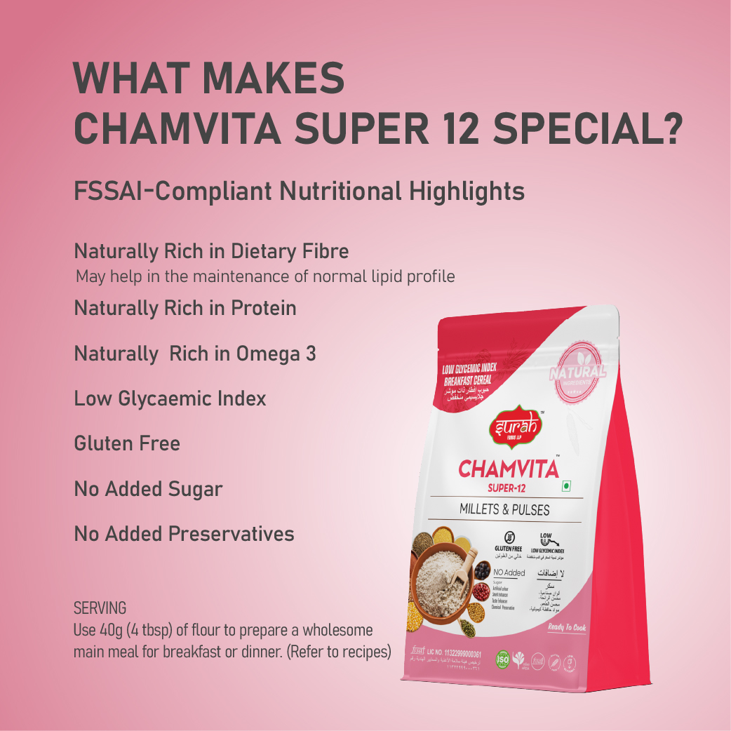 A healthy diet plays a vital role in managing lifestyle diseases. CHAMVITA SUPER 12 is a scientifically formulated flour blend made from selected millets and pulses, to maximize its natural content of Dietary Fibre, Protein, and Omega 3 content. With a Low Glycaemic Index.